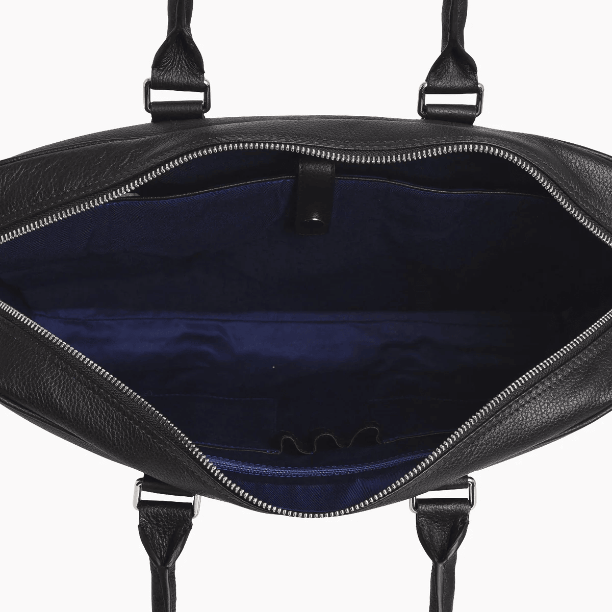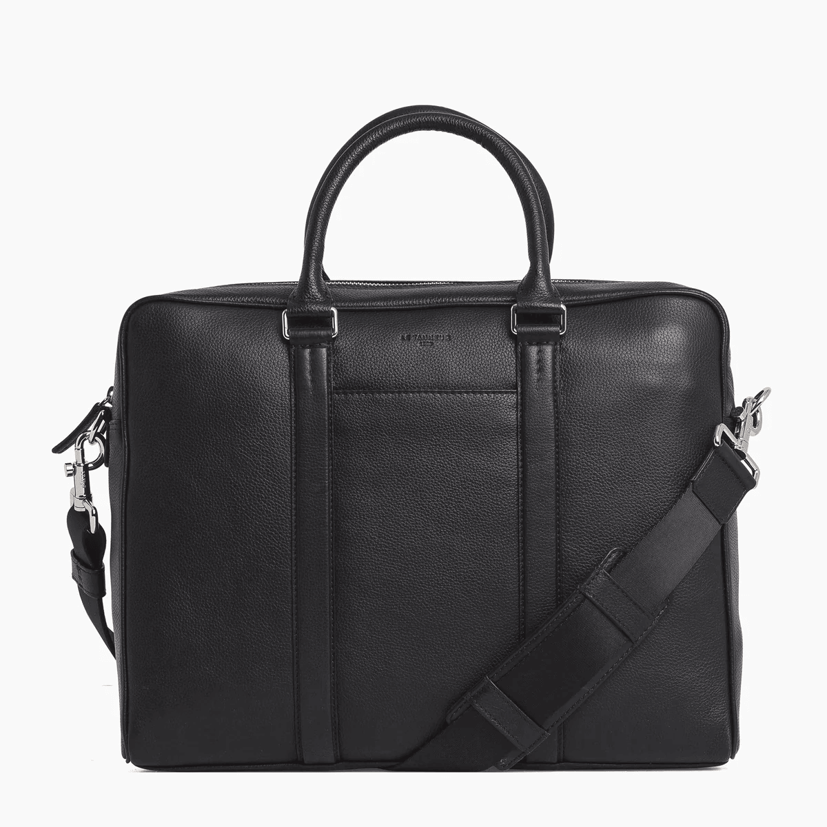 Porte-documents avec poignées rigides et détails finition argent. Bandes ajustées piquées en T, signature de la Maison. Portez-le à la main, à l’épaule ou croisé avec sa bandoulière ajustable amovible. Peut accueillir un ordinateur portable 14”.