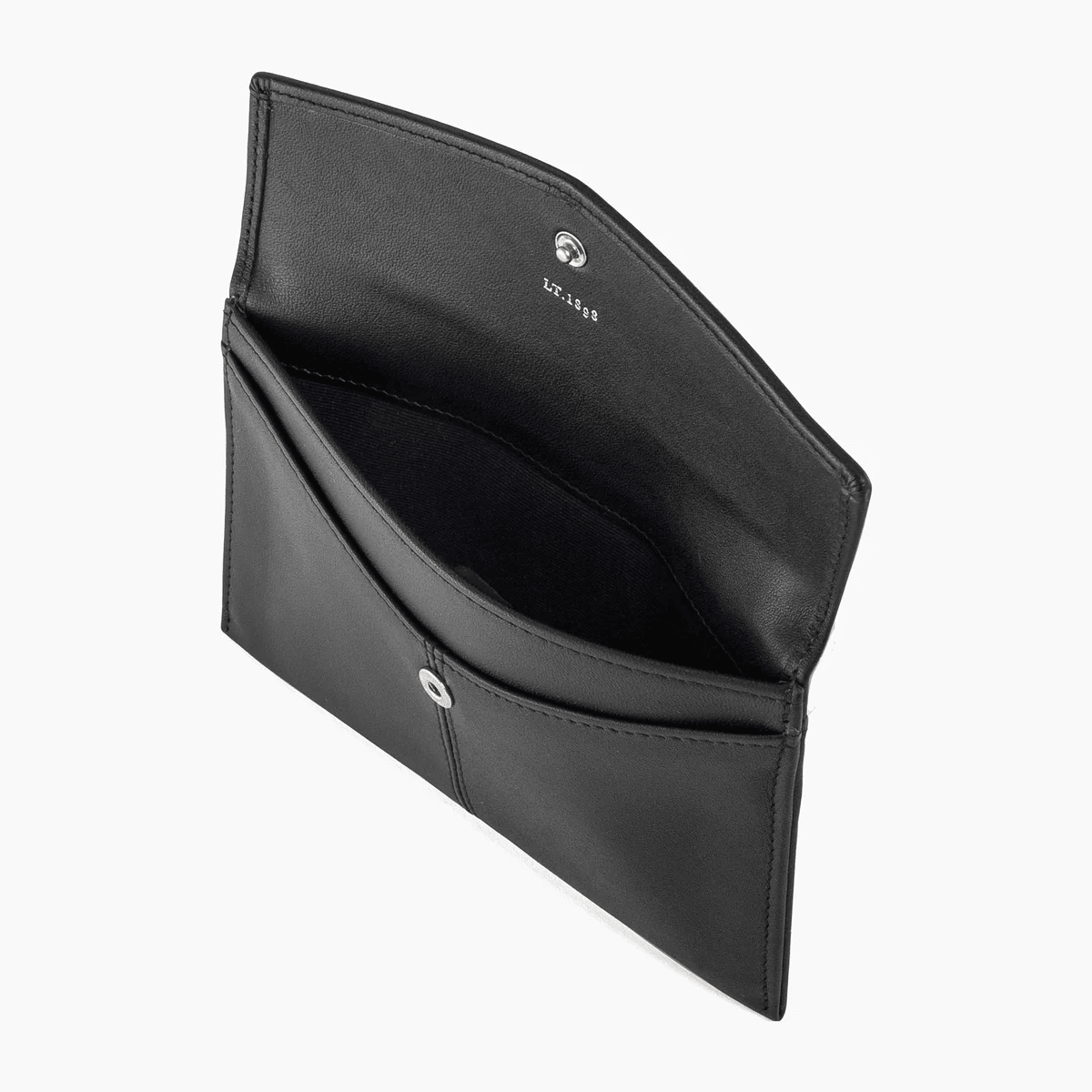 Pochette enveloppe avec fermeture pression et marquage Le Tanneur sur film argent.