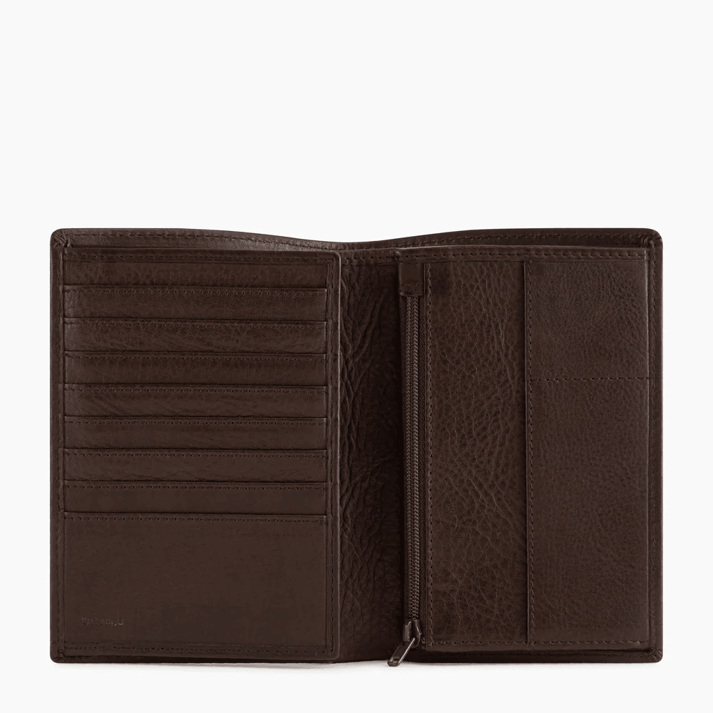 3 poches plates, 2 poches ID, 1 poche monnaie zippée, 2 poches billets et 8 compartiments cartes.