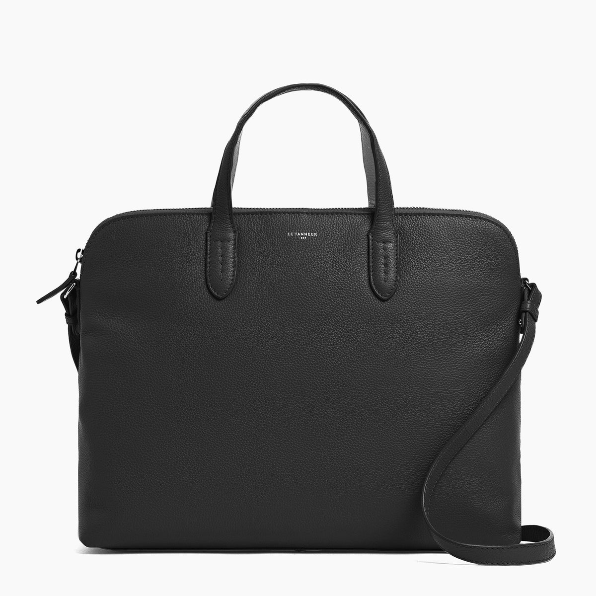 Porte-documents avec pochette ordinateur 14", passant trolley et départs poignées signature. Marquage Le Tanneur et zip finition argent.