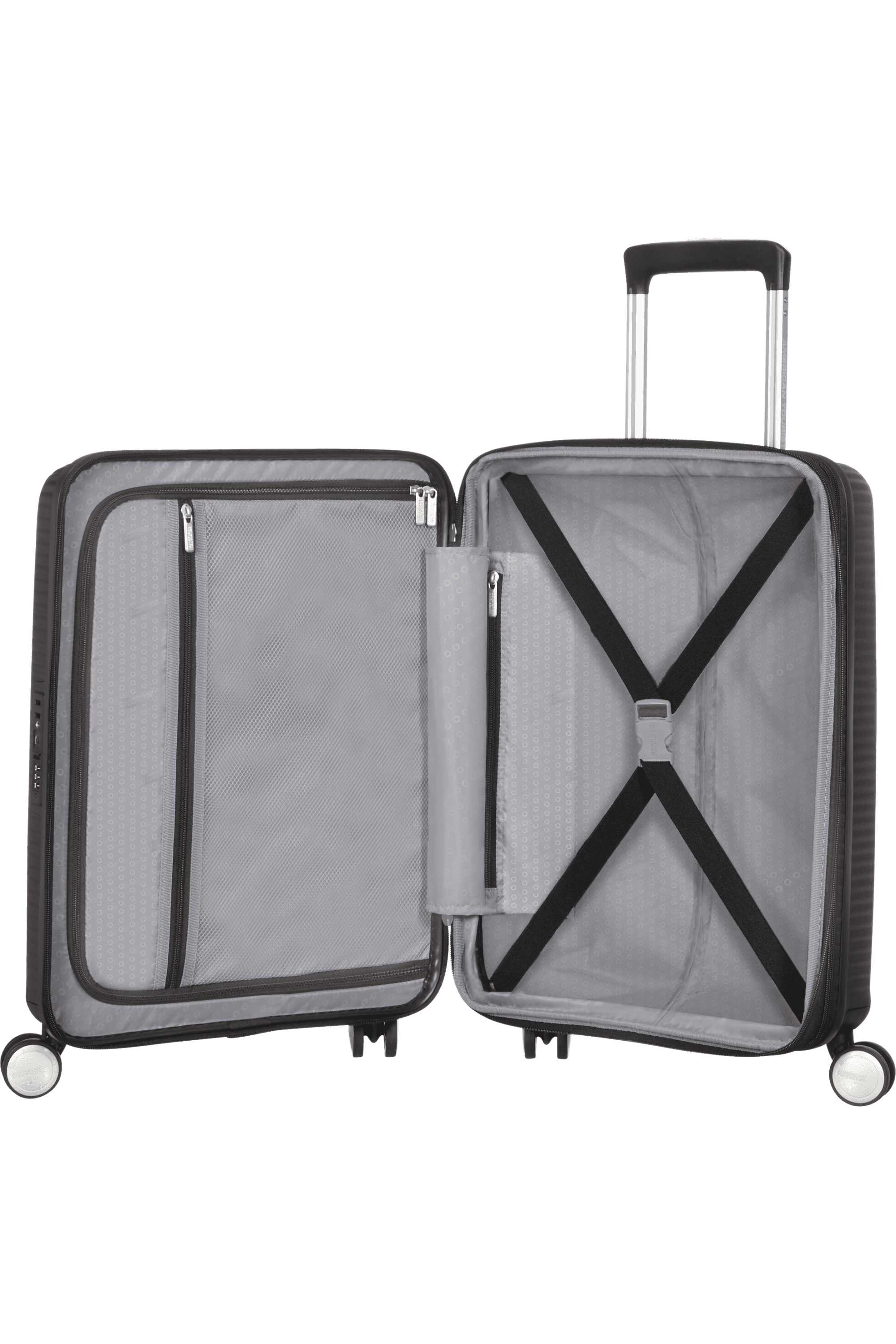 55 x 40 x 20 cm (extensible 23) comprenant poignées, roulettes, pieds, poches latérales et autres éléments extérieurs