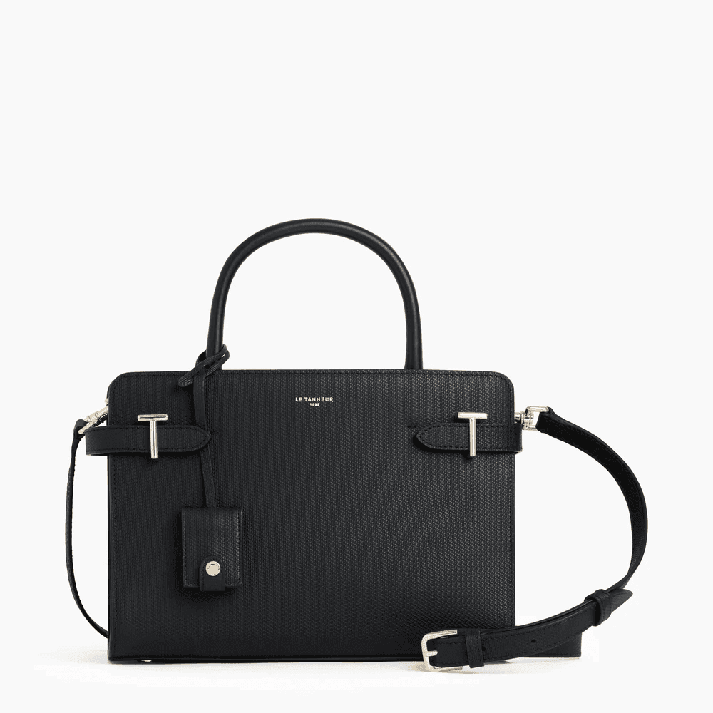 Sac à main moyen modèle rigide arbore les fermoirs T de la Maison. Il dispose de patins de protection et d'un charms amovible. Portez-le à la main, à l'épaule ou croisé grâce à sa bandoulière amovible ajustable.